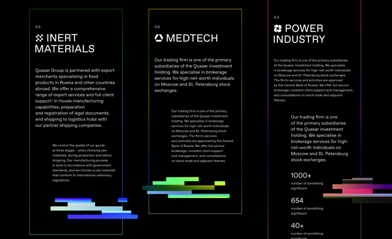 Quasar 是一家私營(yíng)金融和投資公司,旨在整合和管理經(jīng)濟(jì)各個(gè)領(lǐng)域的資產(chǎn)。其興趣屬于投資、管理和業(yè)務(wù)發(fā)展、房地產(chǎn)開發(fā)、工業(yè)安全、建筑和能源領(lǐng)域。