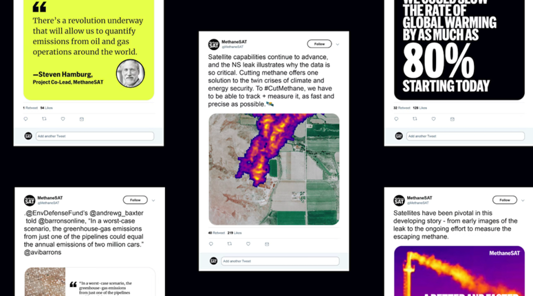 數(shù)據(jù)可視化也是品牌視覺語言的組成部分。為了傳達(dá)問題的緊迫性和減少甲烷的可能性,開發(fā)了簡單但發(fā)自肺腑的數(shù)據(jù)可視化,以幫助讀者了解MethaneSAT 任務(wù)背后的科學(xué)知識。這些可視化巧妙地分層到攝影中,直接將數(shù)字與現(xiàn)實(shí)世界的影響聯(lián)系起來。有目的的簡單,為了在沒有無關(guān)細(xì)節(jié)或標(biāo)簽的情況下放大消息,可視化可以部署在網(wǎng)站、社交媒體、演示文稿等中。