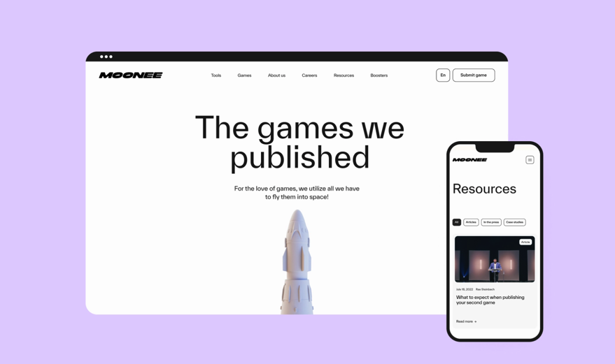 此外,主要圖形元素是帶有圓角的方形板,象征著火箭部件、技術塊、工具箱等。通過品牌重塑,Moonee 擁有了在年底前進入前 10 名游戲發(fā)行商的工具。