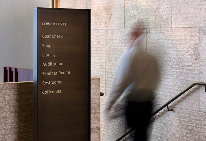 該團(tuán)隊(duì)與建筑師和項(xiàng)目經(jīng)理William McDowell 在標(biāo)牌方面密切合作,在解釋材料和書(shū)籍方面與首席策展人 Judith Dolkart 和出版總監(jiān) Johanna Halford-MacLeod 密切合作。與建筑物內(nèi)的許多元素一樣,標(biāo)牌使用了豐富的青銅和不銹鋼材料調(diào)色板。大堂刻意避開(kāi) LCD 屏幕,轉(zhuǎn)而在澆注混凝土表面投射白色字母。從公園大道上,基金會(huì)通過(guò)一系列“游行”標(biāo)志宣布,這些標(biāo)志針對(duì)車輛和行人的流動(dòng)。在整個(gè)建筑中,各種元素都讓人想起巴恩斯博士的存在:在面向博物館咖啡館的花園墻上,巴恩斯博士的手寫(xiě)合奏符號(hào)是用鍛鐵呈現(xiàn)的;巴恩斯博士的一句話構(gòu)成了噴泉的邊緣。