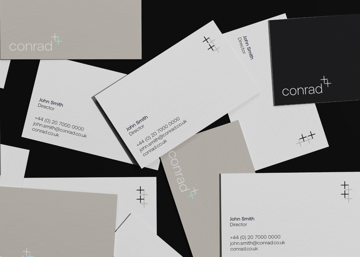 一套品牌宣傳資料的設(shè)計(jì)旨在保持高水平的精致度和一致性。名片采用新品牌設(shè)計(jì),提供觸覺體驗(yàn),采用高品質(zhì)材料和飾面,與簡約設(shè)計(jì)相得益彰。各種品牌材料中“+”符號的使用強(qiáng)化了康拉德的成長、協(xié)作和卓越的主題。